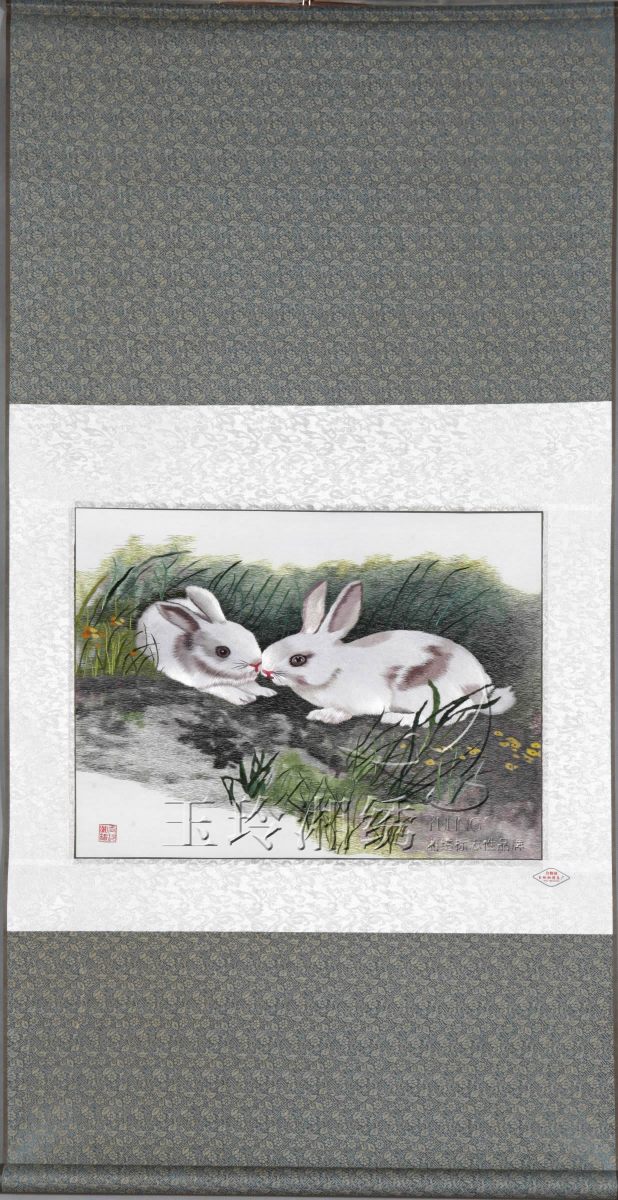 滿意100熱線:400-0731-100 聯(lián)系的時候可以說:請問貨號為:2596 的 雙兔圖 產(chǎn)品,規(guī)格是:繡芯:53*40(cm) ......