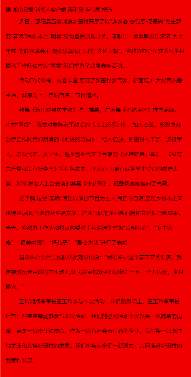 【玉玲湘繡】玉玲湘繡董事長王玉玲隨省政協(xié)慰問湖南新田村 | 新田村:“泥土香”春晚 喜迎新年