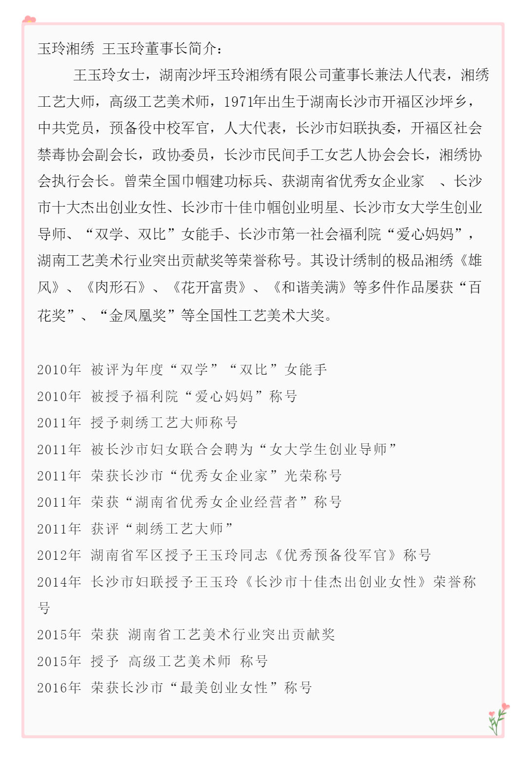 - 玉玲湘繡王玉玲董事中榮獲長(zhǎng)沙市十大杰出創(chuàng)業(yè)女性稱號(hào)