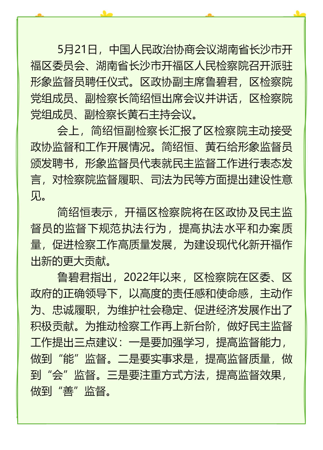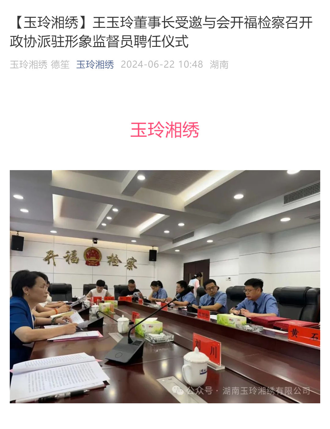 【玉玲湘繡】王玉玲董事長受邀與會開福檢察召開政協(xié)派駐形象監(jiān)督員聘任儀式