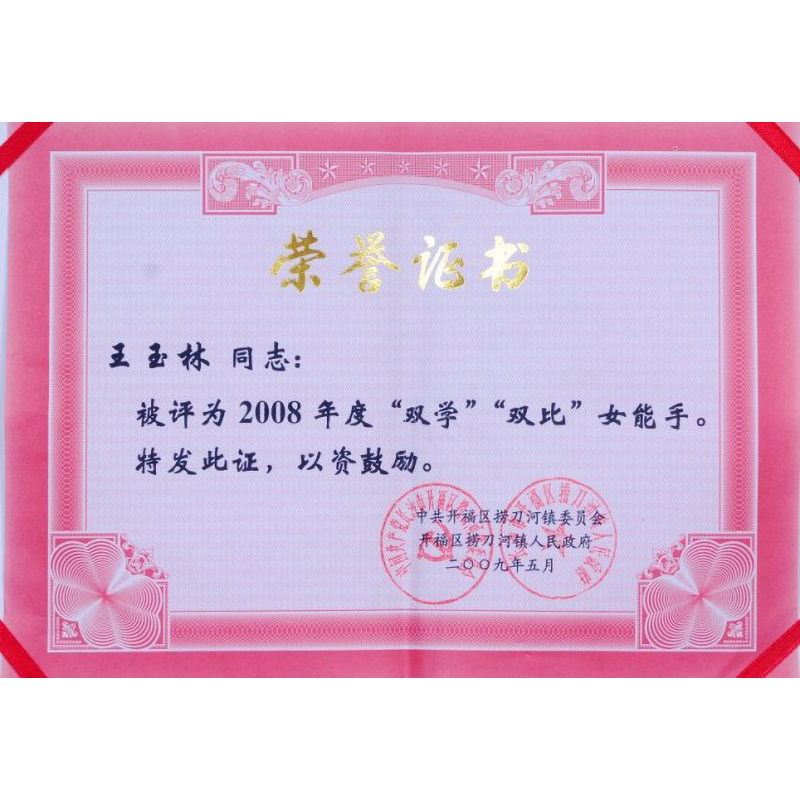 2010年 王玉玲大師被評為年度“雙學(xué)”“雙比”女能手