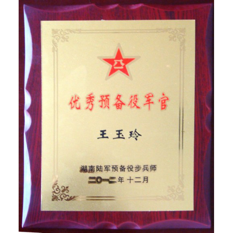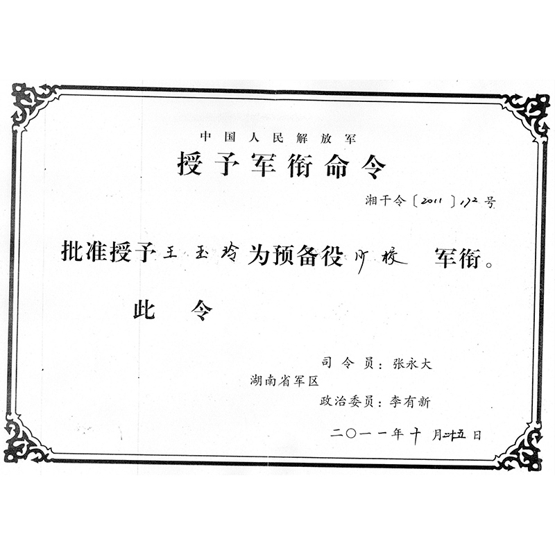 2012年 王玉玲大師湖南省軍區(qū)授予王玉玲同志《優(yōu)秀預(yù)備役軍官》稱號