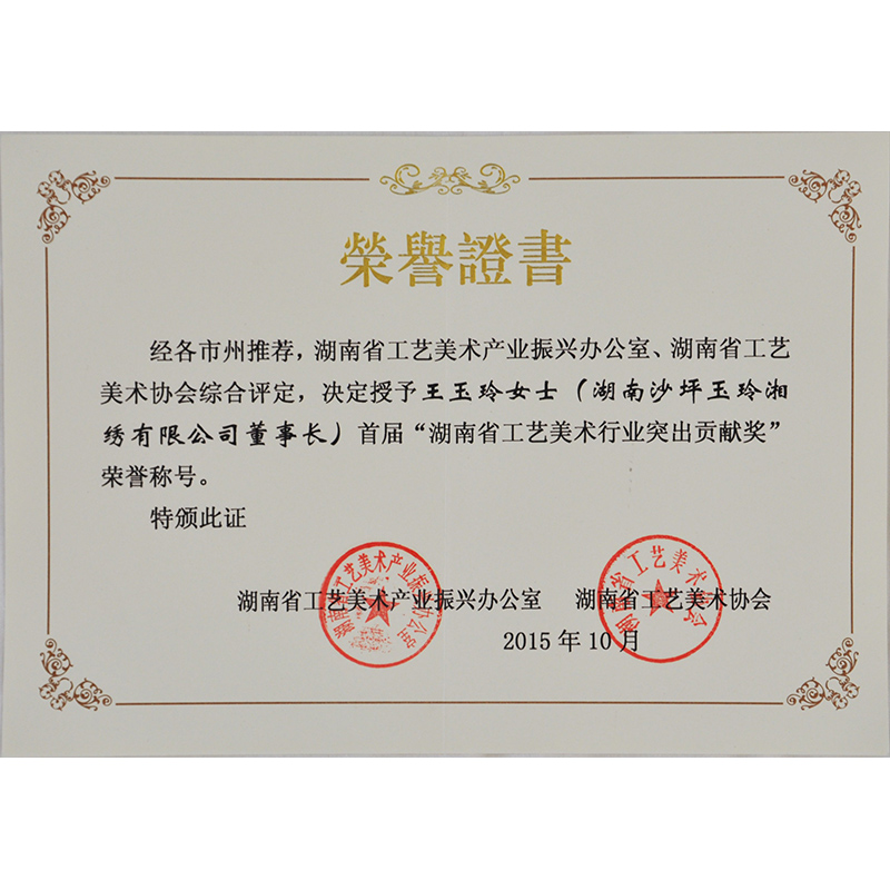 2015年 王玉玲大師榮獲 湖南省工藝美術(shù)行業(yè)突出貢獻(xiàn)獎