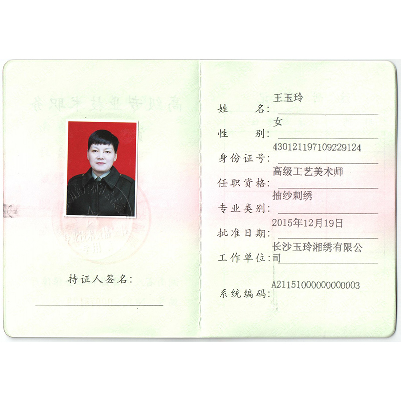 王玉玲女士,湖南沙坪玉玲湘繡有限公司董事長兼法人代表,湘繡工藝大師,高級工藝美術(shù)師,學(xué)士學(xué)位,1971年出生于湖南長沙市開福區(qū)沙坪鄉(xiāng),中共黨員,預(yù)備役中校軍官,政協(xié)委員,婦聯(lián)執(zhí)委,長沙市民間手工女藝人協(xié)會會長,湘繡協(xié)會執(zhí)行會長。曾榮全國巾幗建功標(biāo)兵、獲湖南省優(yōu)秀女企業(yè)家、長沙市十大杰出創(chuàng)業(yè)女性、長沙市十佳巾幗創(chuàng)業(yè)明星、長沙市女大學(xué)生創(chuàng)業(yè)導(dǎo)師、“雙學(xué)、雙比”女能手、長沙市第一社會福利院“愛心媽媽”,湖南工藝美術(shù)行業(yè)突出貢獻(xiàn)獎等榮譽稱號。其設(shè)計繡制的極品湘繡《雄風(fēng)》、《肉形石》、《花開富貴》、《和諧美滿》等多件作品屢獲“百花獎”、“金鳳凰獎”等全國性工藝美術(shù)大獎。