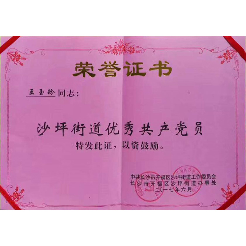 2017年 王玉玲授予沙坪街道優(yōu)秀共產(chǎn)黨員稱號